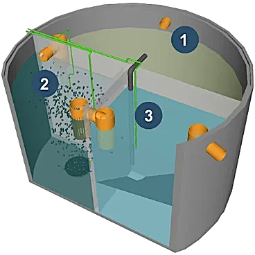 Das häusliche Abwasser gelangt zunächst in die erste Kammer, in welcher die Feststoffe im Abwasser auf den Boden sinken.